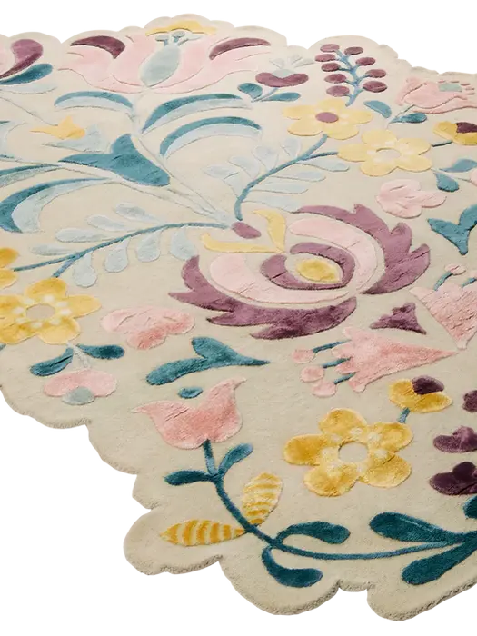The Efflorescent rug features a soft, neutral background brought to life by bold, blooming florals rendered in a vibrant spectrum of botanical silk. Inspired by Scandinavian motifs, its delicate yet expressive design adds a sense of optimism and artistic flair to any space.