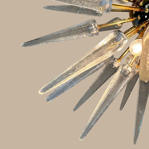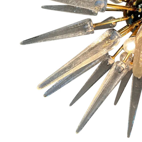 Elevate your interiors with this spectacular Italian Sputnik chandelier, a masterful blend of luxury, craftsmanship, and iconic design. Featuring a brass-plated metal frame and 51 hand-blown transparent Murano glass tips, each element is meticulously crafted in the traditional Murano style, radiating a warm and inviting glow.