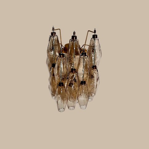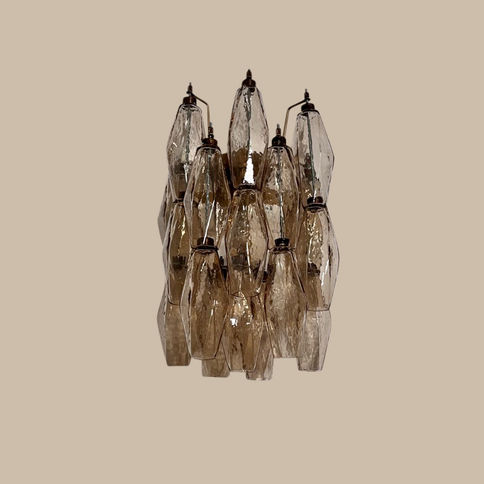 Each applique features 17 hand-blown smoked “Poliedri” glass elements, one of the most iconic Murano shapes, mounted on a solid brass and gold-painted metal frame. The smoked tones diffuse a sophisticated light ;creating a refined atmosphere that elevates any interior.
